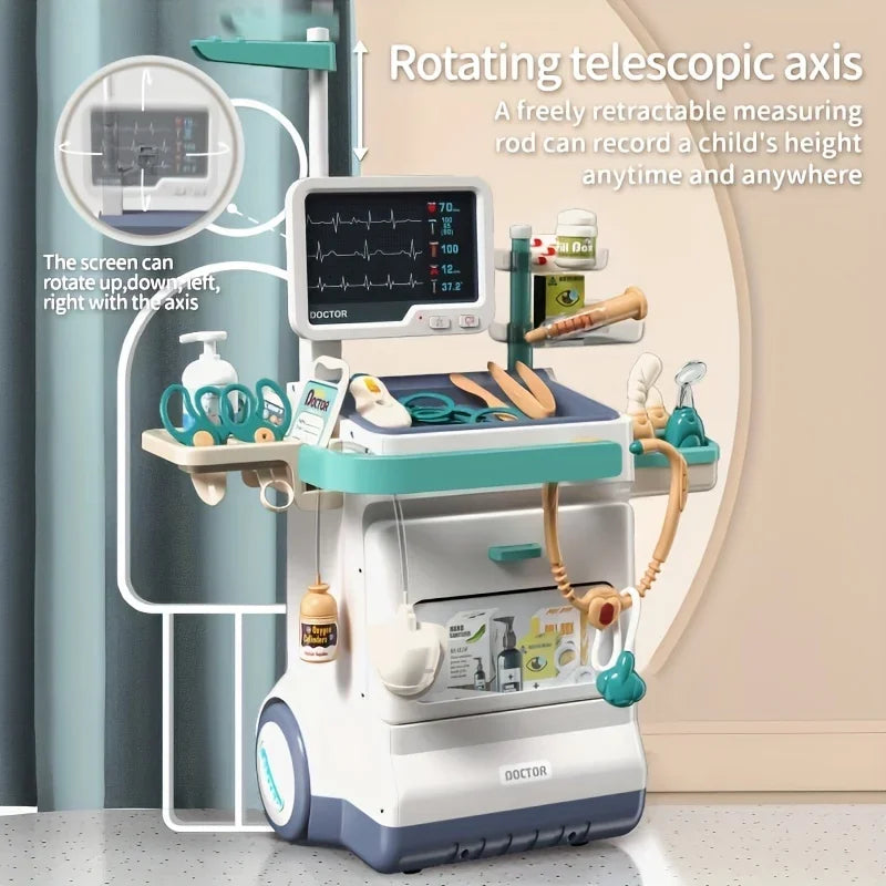 【A complete fun of medical tools】The doctor cart kit comes with a syringe, stomatoscope, thermometer, eye chart, X-ray and more. The Upgraded stethoscope produces an authentic real-life heartbeat sound and light effect. Free telescopic measuring rod at any time to record the child's height.